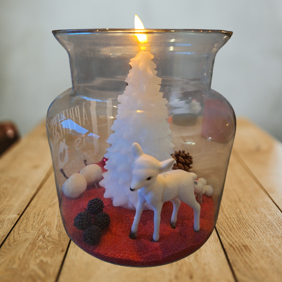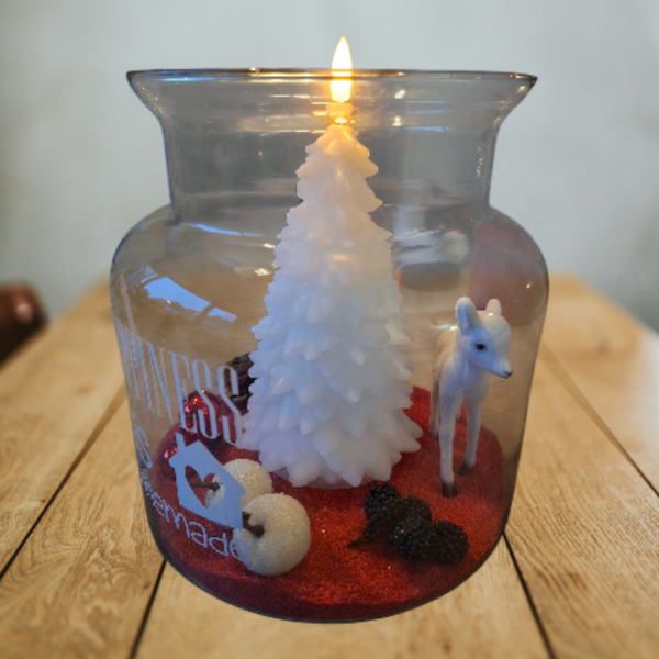 Mooi windlicht met een LED kerstboom. Inclusief batterijen en timer. En leuke decoratie.