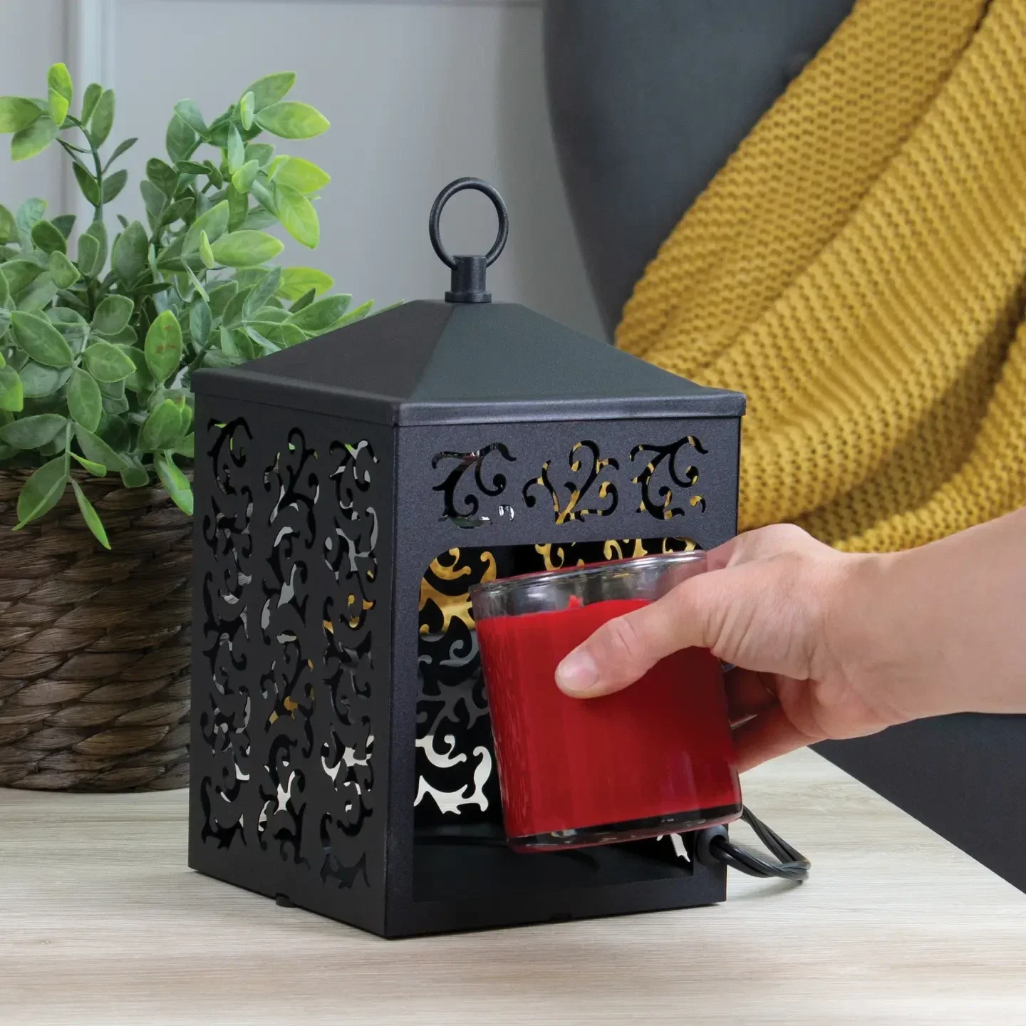 In de gepatenteerde Candle Warmers Cottage lantaarn wordt de geurkaars van bovenaf bestraald door de speciale warmtelamp, waardoor een schoon waszwembad wordt gevormd. De geur ontvouwt zich binnen zeer korte tijd in de kamer. Veel sneller dan bij het traditionele branden van de geurkaars. Kleur: zwart Materiaal: metaal Afmeting 24 cm x 13 cm 25 watt lamp is inbegrepen Elektrische bediening met aan/uit-schakelaar Geleverd in een aantrekkelijke geschenkdoos EU-stekker