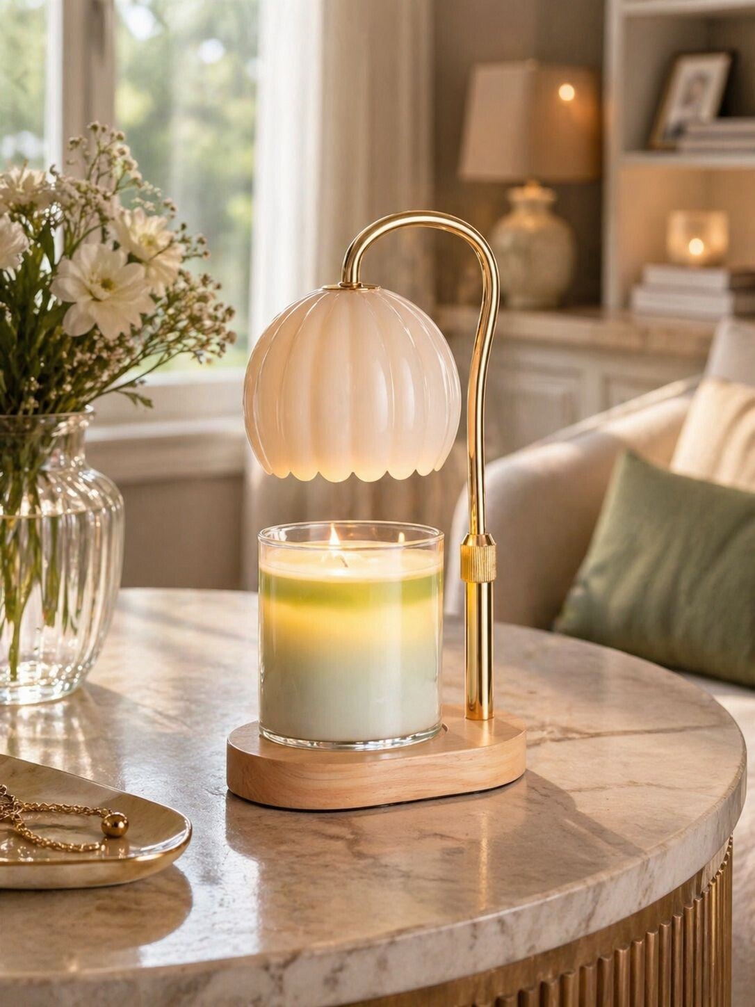 Deze lamp verenigt vintage-charme met modern comfort. De ronde melkglazen kap is versierd met geribbelde en golvende details. Met zijn verstelbare gouden steel en de voet van natuurlijk hout past deze lamp zowel bij klassieke als bij moderne interieurs. Deze Candle Warmers-lamp beschikt over: - hoogteverstelbare lampvoet - timer (2/4/8 uur) - dimbaar wattage (laag/midden/hoog) - 35 Watt Onder de gepatenteerde Candle Warmers-lamp wordt de geurkaars door de speciale warmtebol van boven verwarmd en vormt daardoor een schone waspoel. Binnen korte tijd verspreidt de geur zich in de ruimte. Veel sneller dan bij het conventionele verbranden van de geurkaars.