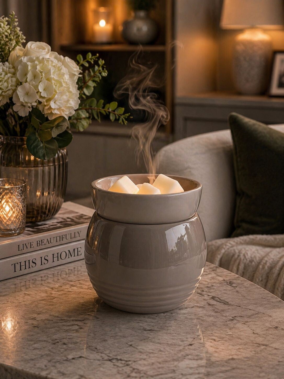 Deze elegante, ronde en neutrale geurverdamper geeft bureaus, balies en nachtkastjes met zijn gladde silhouet en warme afwerking een minimalistisch-moderne stijl. De warmtplaat smelt de was voorzichtig en verspreidt zo een langdurige geur – geheel zonder roet of vlammen. Een stijlvolle en eenvoudige geuroplossing voor kleine ruimtes. FUNCTIE: Afneembaar schaaltje voor uw favoriete geurwaxes of geurtarts. Aan/uit-schakelaar aan het snoer en controlelampje geven de bedrijfsstatus aan. VEILIGE GEUR VOOR KLEINE RUIMTES: Compact formaat, ideaal voor krappe ruimtes. Een veilige alternatieve voor traditionele kaarsen – geen brandgevaar en geen roetvorming in uw woning. SPECIFICATIES: Totale afmetingen: 11,4 x 11,4 x 11,7 cm. Snoerlengte: 91 cm Kleur: grijs Materiaal: reactive keramiek 20 Watt warmtplaat Elektrische werking met aan/uit-schakelaar